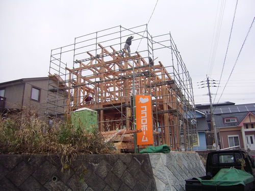 【A様邸 棟上げ】 2012年12月25日 12月25日、A様邸の棟上げがありました。ココロホーム初の戸建て住宅新築工事です。 南小国では昨日から雪が舞っていましたが、市内は大丈夫な様ですね。 市内での施工は初めてになります。パートナーの方々のご協力を頂き施工を進めています。いつもありがとうございます。寒い中での作業になりますがこれからも宜しくお願い致します。受付 岩本