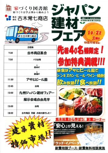 お知らせ→ジャパン建材フェア! 2016年10月16日 来る、10月22日、ジャパン建材フェア!(福岡)が開催されます!ココロホームが参加している家づくり図書館、古木常七商店さまからの参加者募集です!限定40名ですので、早めにご連絡ください!