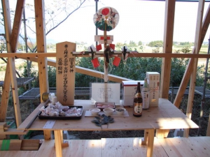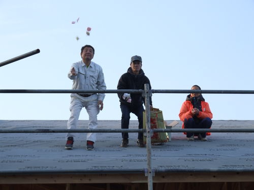 上棟式 2014年11月15日 O様邸の上棟式が行われました!家の骨組みを創り、無事に棟が上がりました。 O様ご家族のお幸せのため、ご期待に添えるよう、しっかりとした工事をさせていただきます。 工事の安全を祈願 豆まきじゃなくて、餅まき!ココロ流、幸せの種まき・・・