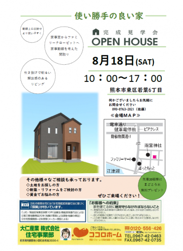 完成見学会のお知らせ♪ 2018年8月16日 こんにちは☆台風が過ぎて、涼しくなるかなと…そうでもないですね(*_*;今週末、熊本市東区若葉にて完成見学会を開催することとなりました☆ 一日だけの開催となりますので、皆様お誘いあわせの上ご来場ください☆