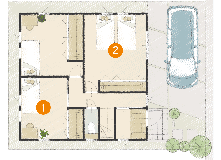 子供部屋を個々にご用意。お子様の成長に合わせて使い方を変えられる間仕切ったプラン。