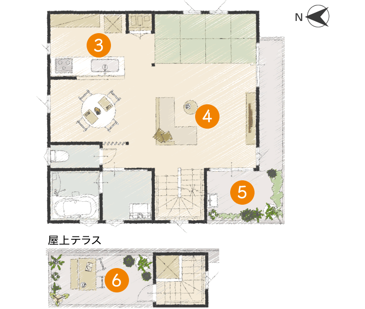 庭付き一戸建てに憧れを持って住まいづくりをお考えの方は少なくないはず。緑と共に暮らしたいという方の為に生まれたプランです。緑いっぱいの庭のある家をと考えていたけれど、土地の広さや道路の方位、様々な要因で思っているような土地に家が建てられない場合があります。そんな場合にも夢を実現できるのが、庭を建物の内側に取り込むという考え方です。