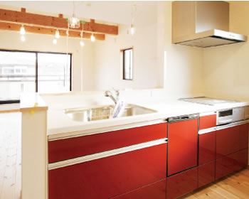 リビングからダイニングたたみコーナーまで見渡せるキッチン。水廻り動線も使い勝手抜群の配置。