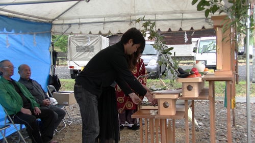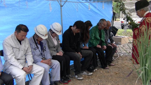 S様邸地鎮祭 2014年5月20日 S様邸の地鎮祭が行われました。 これからの工事の安全と、S様のますますの幸せのため… 雨もおおいに祝福してくれました。 これから長いお付き合いをさせていただきます、どうぞよろしくお願いします。